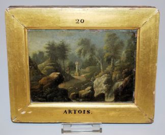0442-Jacques d’Arthois, Nächtliche Felsenlandschaft mit einem Mann an einem Grabmal, kleines ...