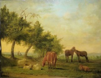 0497-Balthasar Paul Ommeganck, Weidende Pferde, Kühe und Schafe mit Hirte unter Baumgruppe, ...