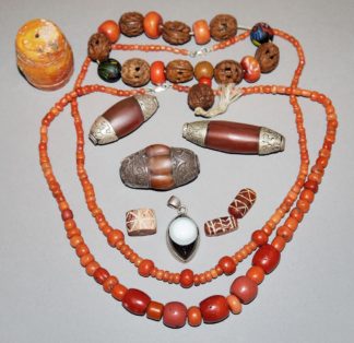 0648-Zwei Edelkorallenketten, Armband, sieben Perlen und ein Amulett, Himalaya und China