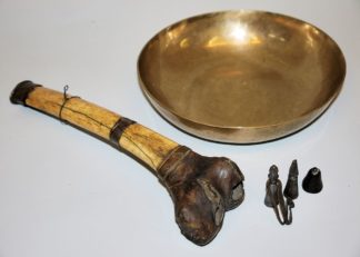 0649-Schamanistische “Knochentrompete”, Klangschale und drei Siegel, Tibet 19. Jh. und älter