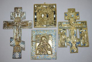 0728-Zwei orthodoxe Segenskreuze und zwei Ikonen aus Bronze, Russland 18./19. Jh.