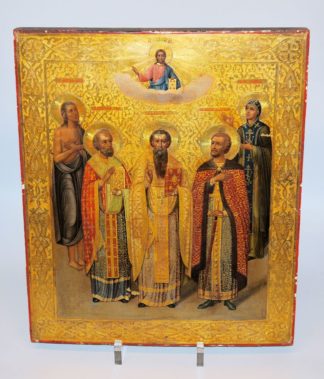 0731-Ikone mit dem Hl. Nikolaus, dem Hl. Basilius d. Weisen und Fürst Alexander Newski, Russland, ...