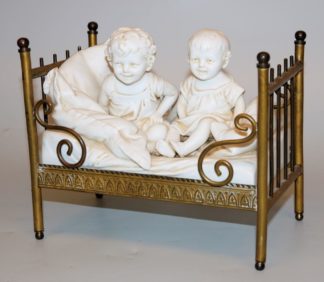 0740-Kinder im Bett, Bisquitporzellan-Gruppe auf Metallbett um 1890/1900