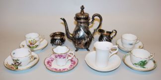 0822-Silber- Mokkakern & 6 Porzellan-Mokkatassen Meißen, Herend u. Limoges