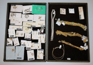 0880-12 Broschen, 2 Clips, 2 Anhänger, 11 paar Ohrringe, Slg. Ketten, 2 Armbänder, Gold & 3 ...