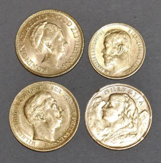 0902-4 Goldmünzen: 5 Rubel Russland 1898, 20 Mark Preußen 1899, 10 Gulden Niederland 1926 und 20 ...