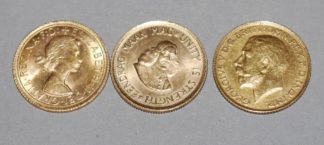 0903-Drei Goldmünzen: Sovereign George III. 1911, Sovereign Elisabeth II. 1966, Großbritannien ...