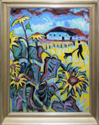 0098-P.W.E monogr. Expressionist, Sonnenblumen vor einem Gehöft, Ölgemälde, alt gerahmt