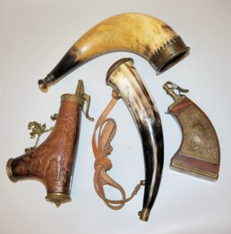 1112-Drei Pulverhörner und ein Signalhorn, nach alten Vorbildern, alle 20. Jh.