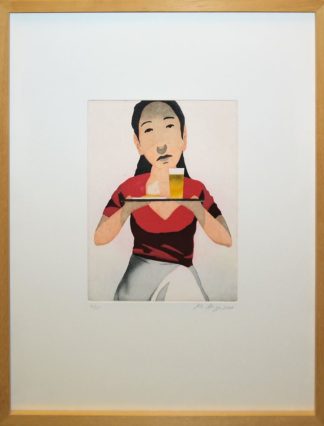 0171-Johannes Hüppi, Kellnerin mit Weißweinglas, große signierte Farbaquatinta-Radierung von 2005