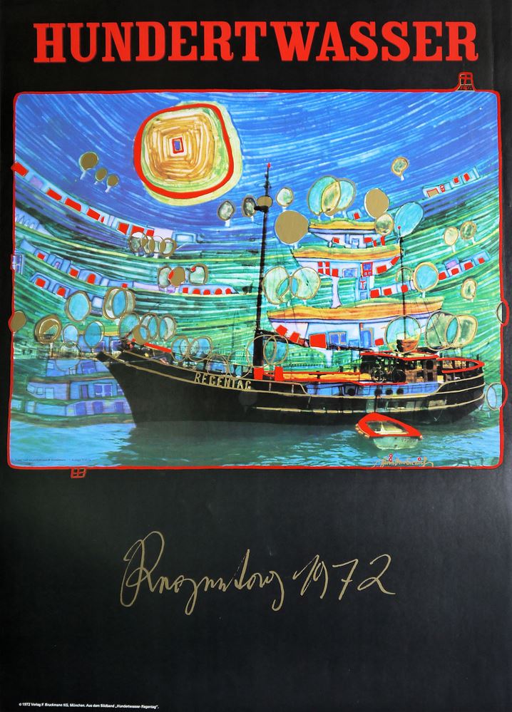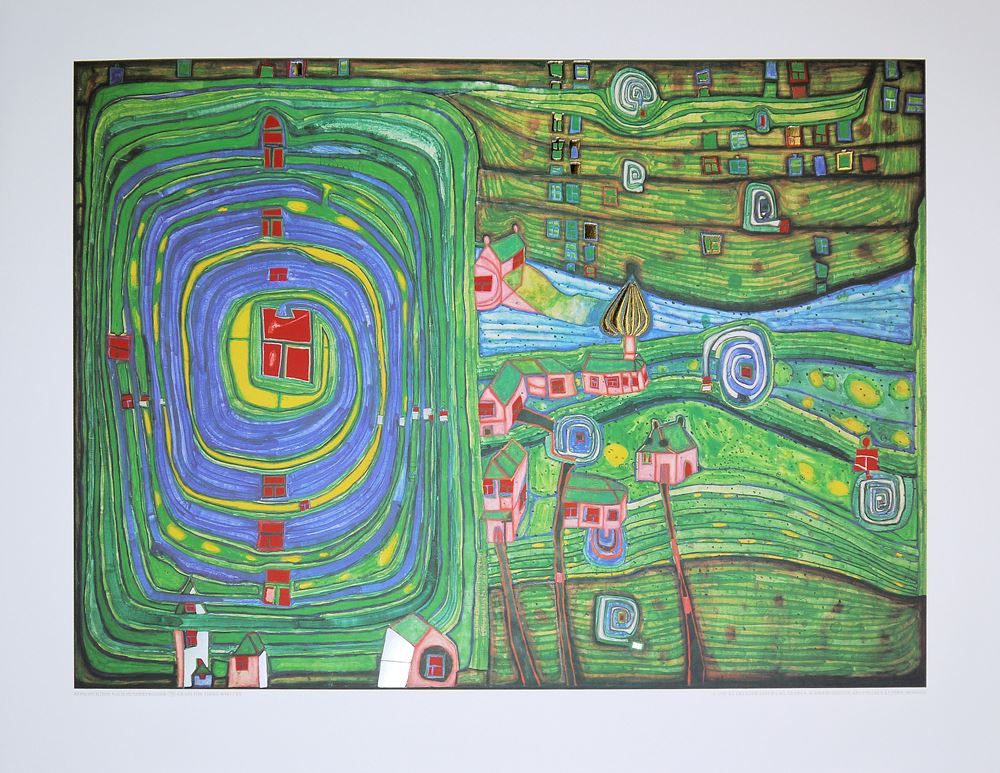 Friedensreich Hundertwasser, Grass For Those Who Cry, Farblithographie mit Metallprägung, Edition Ars Collect, Luzern 1995, dazu Plakat "Regentag 1972"
