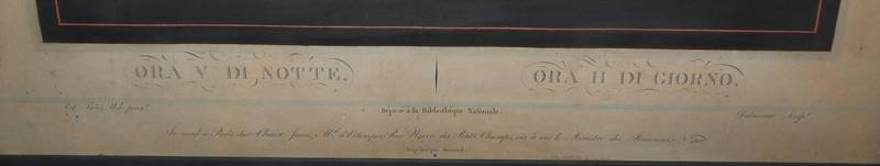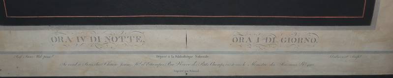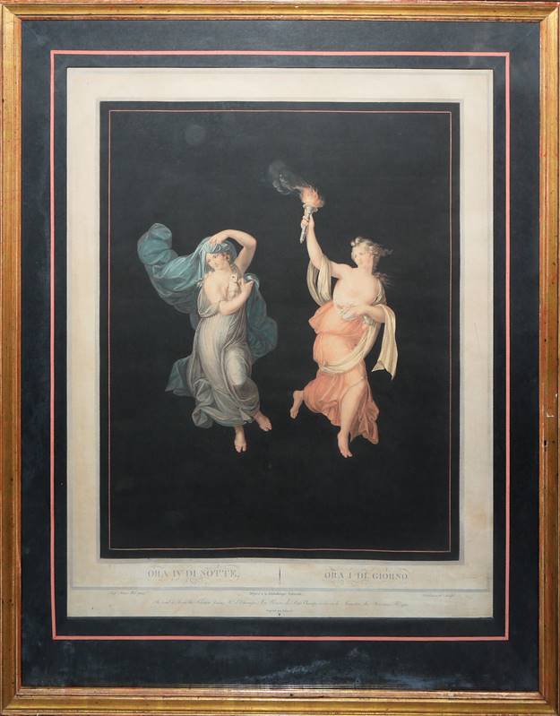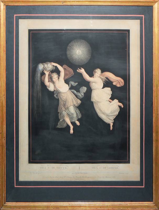 Philibert-Louis Deboucourt, 1755 - Paris - 1832, 2 Aquatinta-Radierungen nach Raffael: "Ora IV di Notte - Ora I di Giorno" & "Ora V di Notte - Ora II di Giorno" (Fenaille 168, 169), je: 53 x 43,5 cm, der helle Blattrand jeweils etwas fleckig, beide unter Zier-Passepartout u. Glas in Goldrahmen, einmal verso mit kleinem Ausbruch