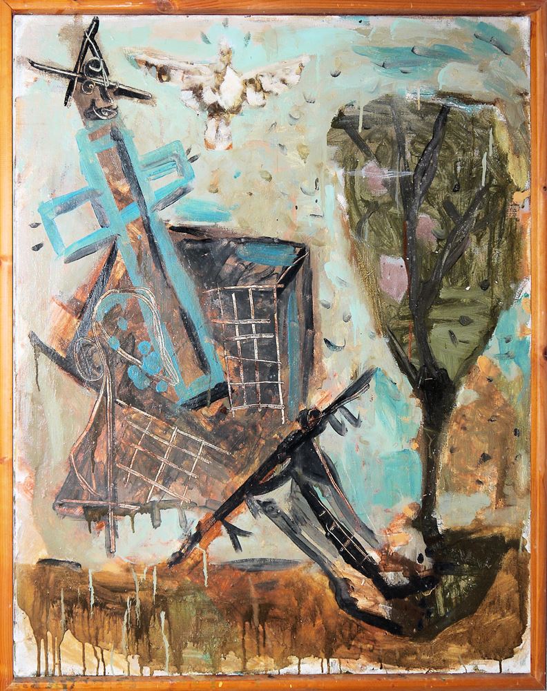 Junior Toscanelli, *1971 Siegburg-Düsseldorf, deutscher Maler, hier: "Sonntags-Komposition", neo-surreale Arbeit mit Kreuz, einer Friedenstaube, einem Baum u.a., Öl/Lw., 100 x 80 cm, verso tituliert, datiert 1990 und signiert "Junior", im Holzrahmen