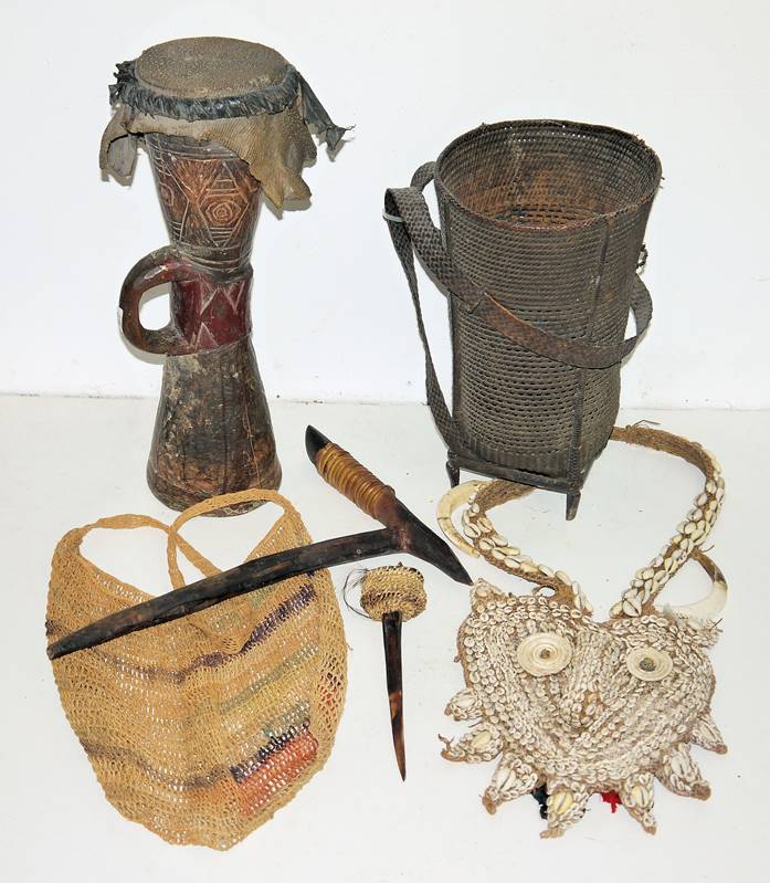 Sechs Zeremonial- und Alltagsobjekte aus Papua-Neuguinea Traditionelle "Sanduhrtrommel", aus leichtem Holz mit Fellbespannung, H 45,5 cm; fein geflochtener Tragekorb, H 36 cm; Steinaxt mit Holzgriff, L 39 cm; Dolch aus Kasuar-Knochen, L 23,5 cm; geknüpfte Tragetasche und ein Pektoral mit Maskengesicht, gefertigt aus geknüpften Schnüren mit Muscheln und Eberzähnen, L mit Gurt 67 cm