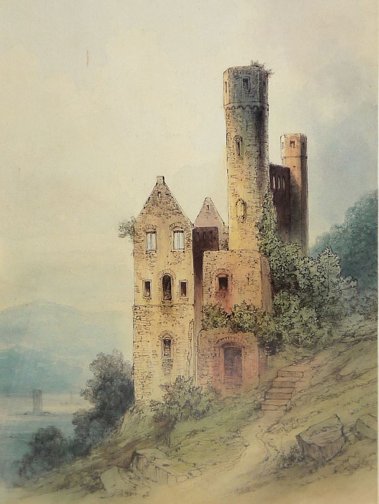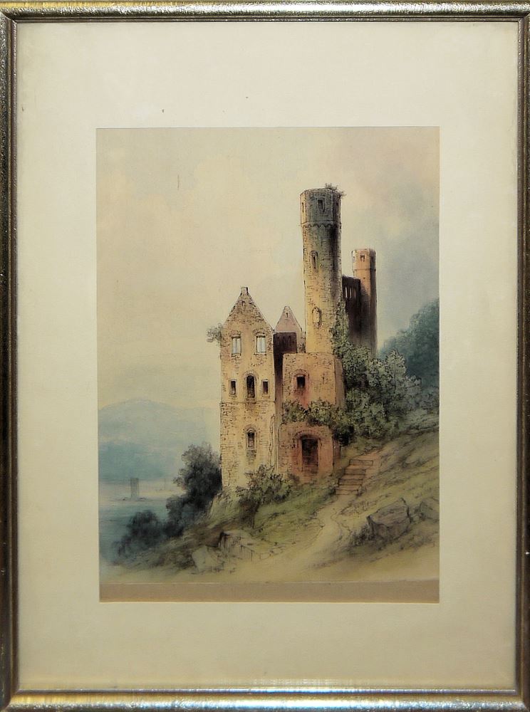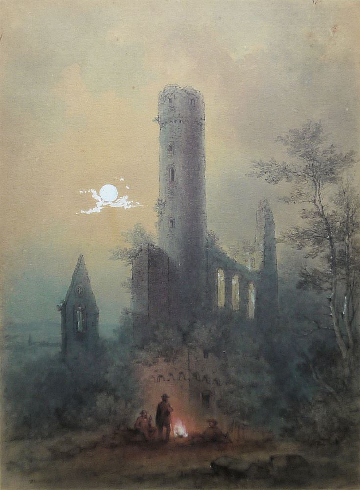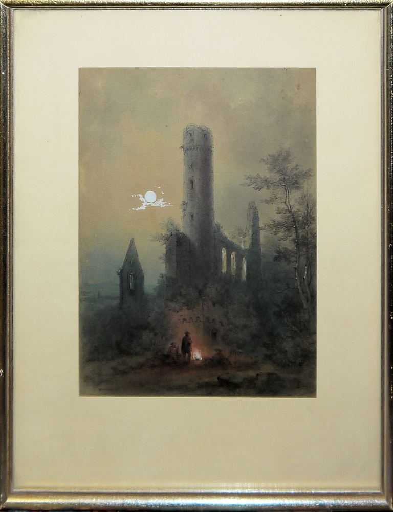 Theodor Anton Joseph Maria Verhas, 1811 Schwetzingen - 1872 Heidelberg, Zeichner und Maler der Romantik, Blick auf Burgruine unter leicht bewölktem Himmel, 29,5 x 22 cm, Aquarell/ dünnem Karton/ auf Karton befestigt, hinter P.p. und Glas gerahmt, gleiche Burgruine aus gleicher Perspektive mit Wanderern: https://www.neumeister.com/kunstwerksuche/kunstdatenbank/ergebnis/272-208/Theodor-Verhas/auf Aquarell; Burgruine bei Nacht im Mondschein mit Rastenden am Feuer, Aquarell/ dünnem Karton, 27 x 20 cm, l. u. sign., hinter Glas und P.p. gerahmt.