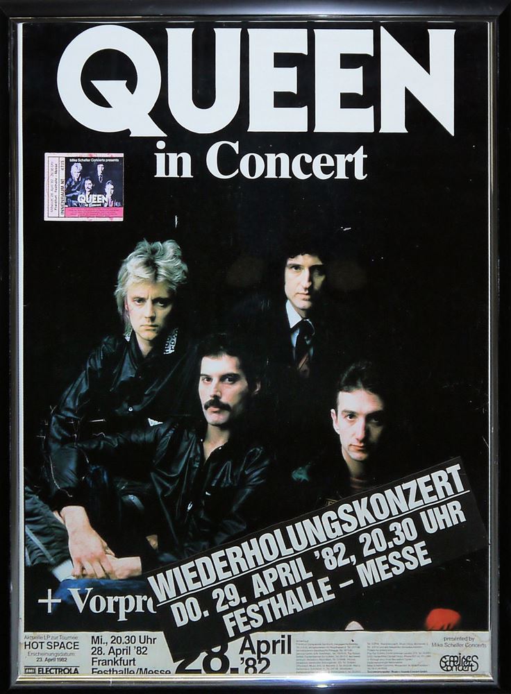 "Queen in Concert", Originales Konzertplakat mit Eintrittskarte & Extra-Plakat für ein Wiederholungskonzert am Folgetag, Frankfurt 1982 , alles zusammen gerahmt
