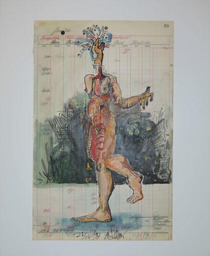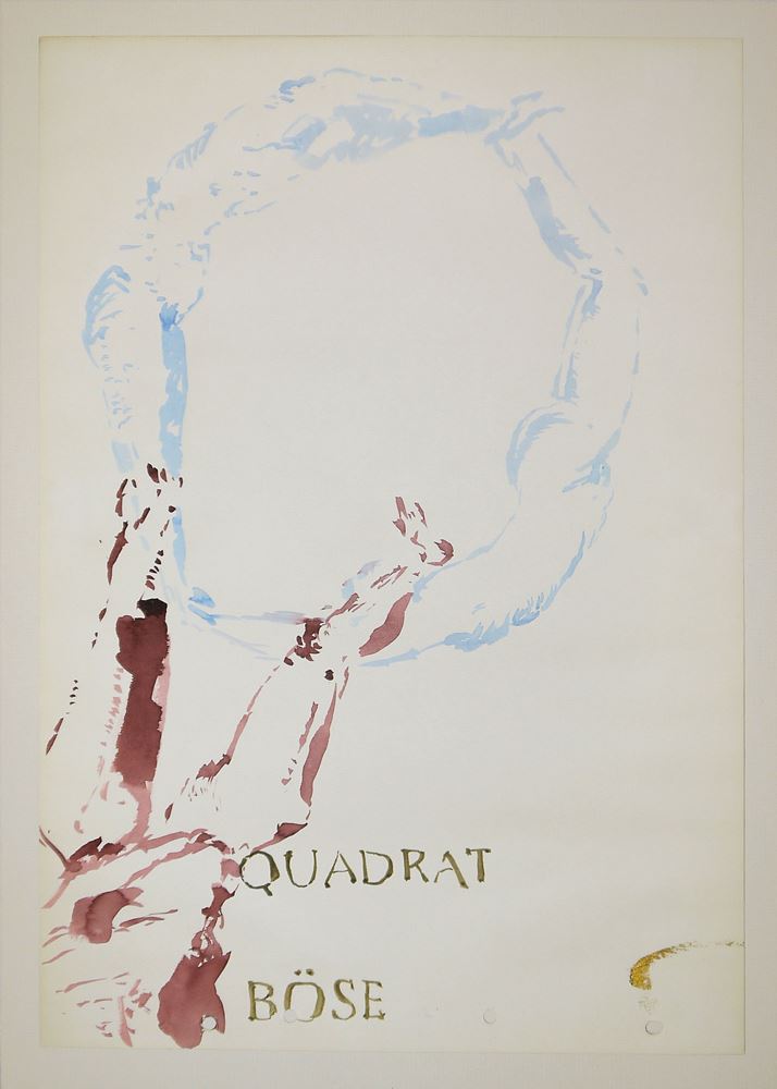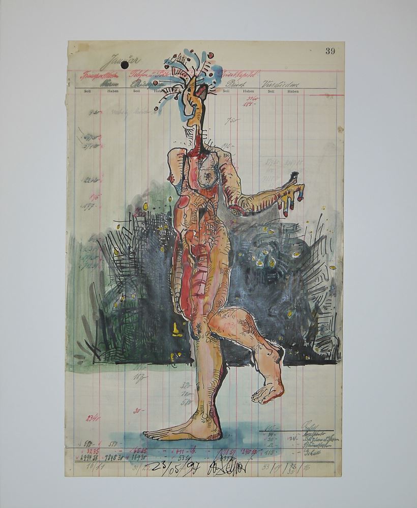 Hans Peter Adamski, *1947 Kloster Oesede, deutscher Maler und Grafiker. Er gehört zu gehört zu den wichtigsten Vertretern der "Neuen Wilden", hier: "Quadrat Böse", Aquarell, 42 x 28 cm, verso sign. u. dat. (19)97 // Thomas Gatzemeier, *1954 Döbeln, deutscher Autor, Bildhauer und Maler, hier weiblich-männlicher Akt, Aquarell auf altem Buchhaltungspapier, 42x26cm, sign. u. dat. (19)97