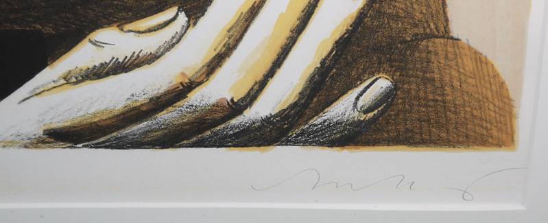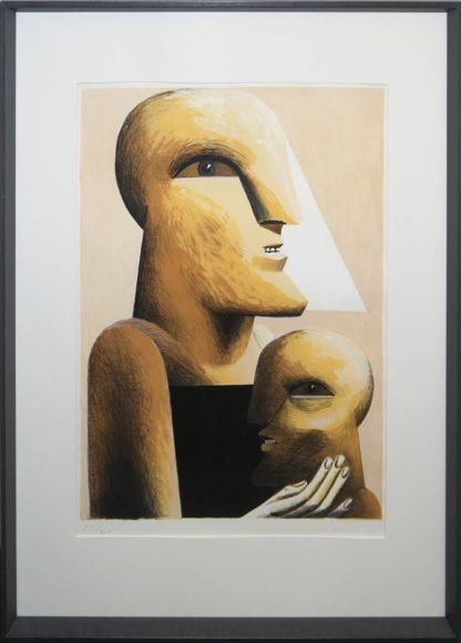 Horst Antes, *1936 Heppenheim, Maler, Grafiker und Bildhauer, studierte 1957-1959 bei HAP Grieshaber an der Akademie der Bildenden Künste in Karlsruhe Malerei. Kennzeichnend sind seine ab 1962 entstandenen Kopffüßler, bei denen Anregungen durch die Kachina-Puppen der Puebloindianer eine Rolle spielten, die lange Zeit sein einziges Motiv waren, hier: Mutter mit Kind n. r., Farblithographie, 66 x 50,5 cm, numm. 116/200, sign., hinter P.p. und Glas gerahmt