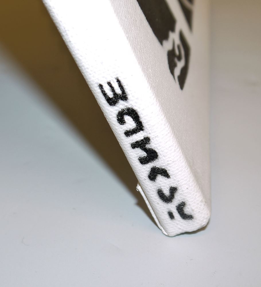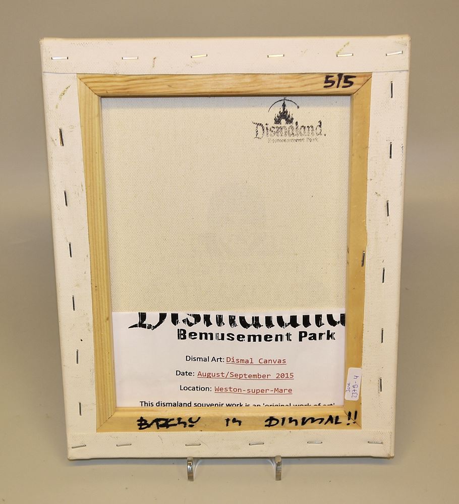 Banksy, Dismal Canvas, Keep Your Coins I Want Change, Dismaland, Pochoir von 2015 Banksy, *1974 Bristol, Dismal Canvas, Keep Your Coins I Want Change, Pochoir/Lw., aus dem Themenpark Dismaland 2015, 29,5 x 23,5 cm, verso bezeichnet und gestempelt, nummeriert 5/5 (die ehemalige Eintrittskarte liegt uns vor)