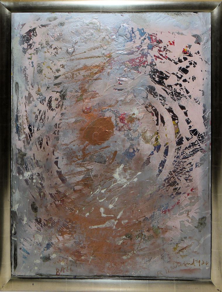 Rudi Baerwind, 1910 Mannheim - 1982 Mannheim, "Ball", abstrakte Komposition, teils pastoser Farbauftrag, Mischtechnik/Papier/Platte, 89 x 69 cm, signiert, datiert 1974, betitelt, im Silberrahmen
