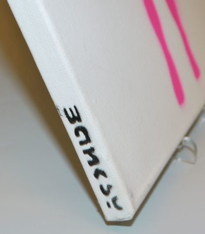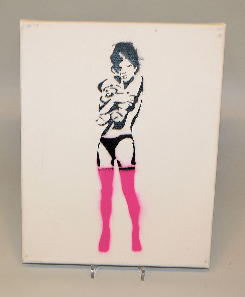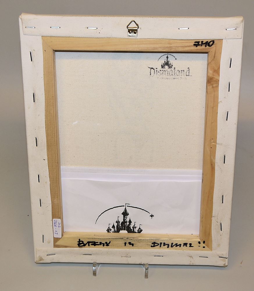 Banksy, Dismal Canvas, Banksy Mädchen umarmt Teddy, Dismaland, Pochoir von 2015 Banksy, *1974 Bristol, Dismal Canvas, Banksy Mädchen umarmt Teddy, Pochoir/Lw., aus dem Themenpark Dismaland 2015, 29,5 x 23,5 cm, verso bezeichnet und gestempelt, nummeriert 7/10 (die ehemalige Eintrittskarte liegt uns vor)