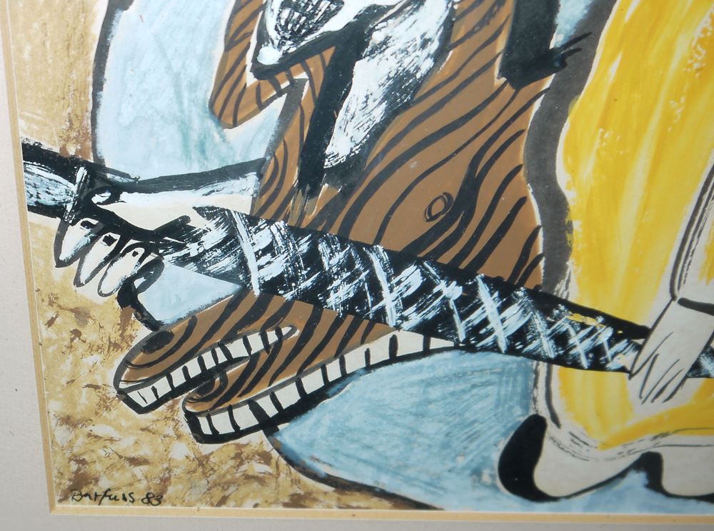 Ina Barfuss, *1949 Lüneburg, deutsche KünstlerIn, hier: Eine Frau und ein Mann sitzen nebeneinander, in ihrer Mitte dominiert eine gestreifte Katze mit "bösem" Blick, Deckfarben/Öl/ Papier, ca. 32 x 22 cm, l. u. sign. u. dat. 83, unter P.partout ansprechend gerahmt