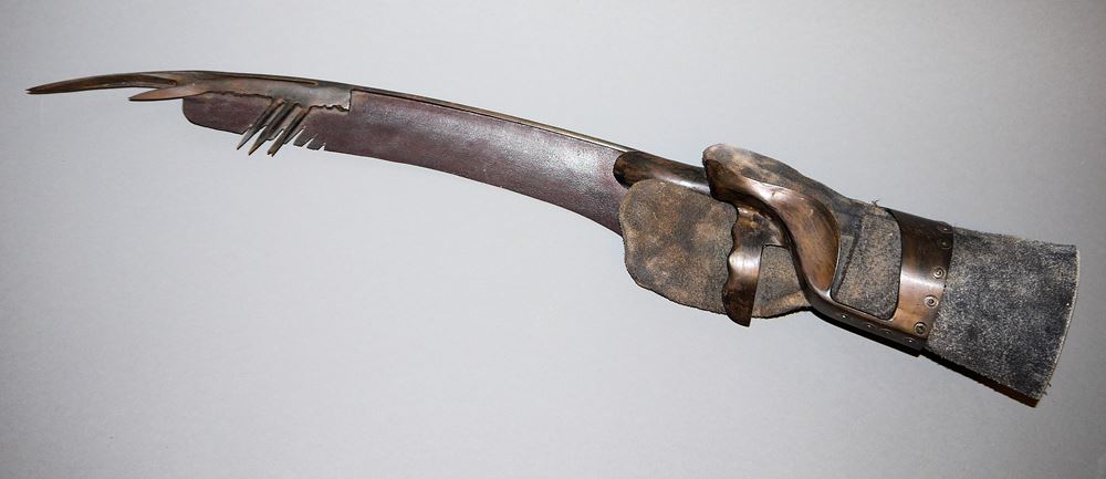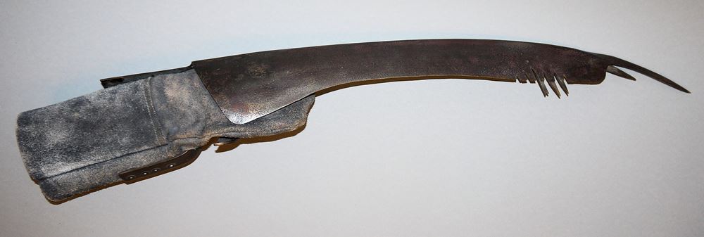Wolfgang Bier, Langer "Sensenhandschuh", Leder & Eisen Wolfgang Bier, 1943 Mährisch Trübau/Sudetenland - 1998 Schwäbisch Hall, deutscher Bildhauer, Maler, Graphiker und Keramiker, hier: Schwerer Arbeitshandschuh aus Leder, verlängert mit einer scharfen, gezackten Sense aus Eisen, L 84 cm