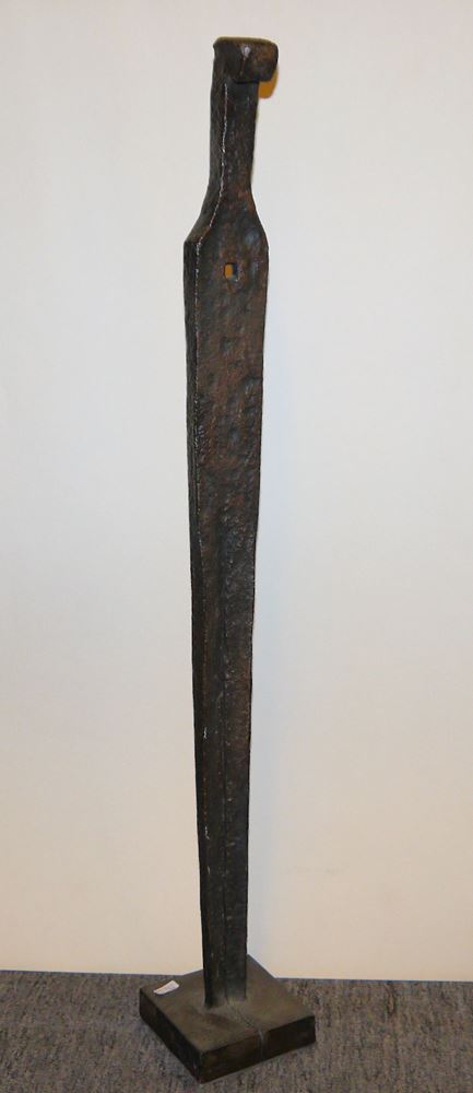 Christa von Schnitzler (1922 - 2003) zugeschr., Stele, abstrahierte, überlängte menschliche Figur, Bronze mit brauner Patina, H 87 cm // Oscar Wiggli (1927 - 2016) zugeschr., Ohne Titel, abstrakte Eisenplastik auf quadratischem Sockel, 30 x 30 x 30 cm