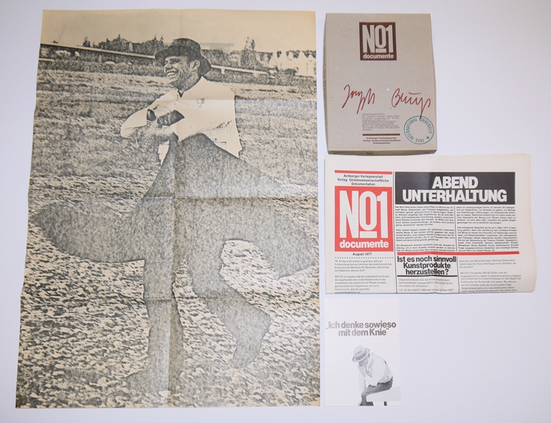 Joseph Beuys, 1921 Krefeld - 1986 Düsseldorf, No 1 documente, 1977, Informationsmaterial: Zeitung (Abendunterhaltung, August 1977), horizontal gefaltet, mit wenigen Bleistift-Unterstreichungen - Plakat (Beuys vor der Überfahrt), Achberg, Copyrightstempel des Herausgebers verso, Offsetlitho, 59,3 x 41,8 cm, ohne Eindruck, Faltspuren, kleine Randläsuren und leichte Randknicke - Postkarte (Ich denke sowieso mit dem Knie), Achberg, alles in bedrucktem OPappkarton, 22 x 16 x 1,5 cm, typografisch nummeriert auf einer Außenseite des Kartondeckels: 795, signiert und Stempel „FREE INTERNATIONAL UNIVERSITY“ in blaugrün auf Kartondeckel, Achberger Verlag, Achberg (Hrsg.). Wvz. Schellmann, 1985 (6. Auflage), Nr. 175., Copyrightstempel des Herausgebers im Kartondeckel, ISBN 3-88103-081-6, kleiner Einriss in der oberen Außenseite, Kartonrückseite minimal geknickt