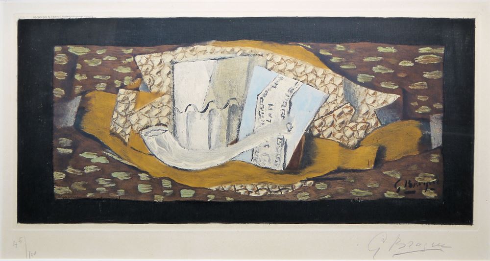 Georges Braque,1882 Argenteuil - 1963 Paris, Nature Morte au verre et a la Pipe (Still Life with Glass and Pipe), Collotypie/Farbaquatinta-Radierung, 19,5 x 46,5 cm, signiert, nummeriert 46/100, Editions C. Guillard, Paris 1959, unter P.p. und Glas gerahmt