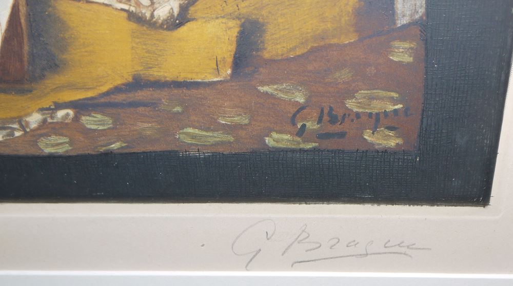 0047-Georges Braque, Nature Morte au verre et a la Pipe (Still Life with Glass and Pipe), Collotypie mit Aquatintaradierung von 1959, gerahmt