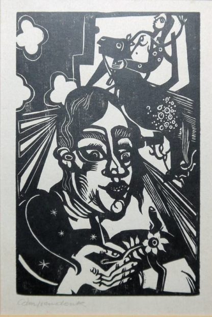 Heinrich Campendonk, 1889 Krefeld - 1957 Amsterdam, dt. Expressionist, Mitglied der Gruppe "Blauer Reiter", 1926-33 Prof. an d. Düsseldorfer Akademie, hier: Frau eine Blume in der Hand haltend, Holzschnitt, kräftiger Abzug, Papier gleichmäßig etwas gebräunt, 17,9 x 12,1 cm, signiert, Wvz. Engels 32, unter Passepartout und Glas gerahmt, dazu Engels/Söhn, Heinrich Campendonk, Das Graphische Werk, Edition GS Düsseldorf 1996, mit 2 Original-Holzschnitten, Auflage 500 Expl., Gzln m. Schutzumschlag, sehr guter Zustand