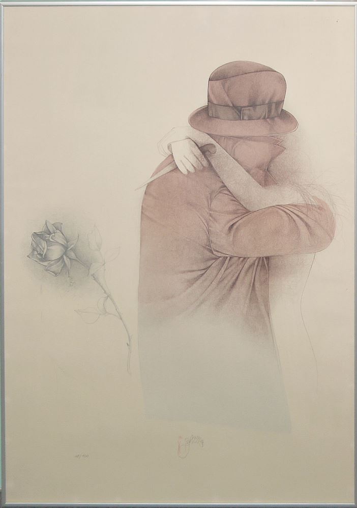 Bruno Bruni, *1935 Gradara bei Pesaro/Italien, italienischer Maler, Grafiker und Bildhauer, hier: "Chiaro di Luna", Farblithographie, 90 x 63 cm, signiert, betitelt, datiert 1987 u. num. 81/299 und Umarmung mit Rose & Messer, Farblithographie, 78 x 58 cm, signiert, datiert 1988 u. num. 48/100 hinter Glas gerahmt