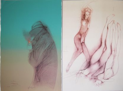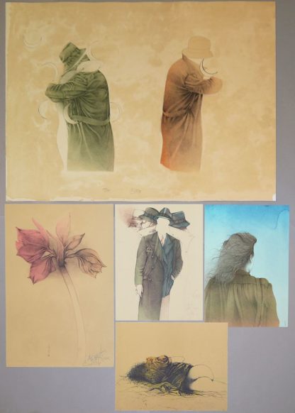 Bruno Bruni, *1935 in Gradara bei Pesaro, italienischer Maler, Grafiker und Bildhauer, hier: 7 Farblithographien, "Contovento-Gegenwind", 100 x 71,5 cm, im Stein sign., dat. 07, leicht Knickfalten an oberer l. Ecke; "senza titolo", 98 x 70 cm, im Stein sign. u. dat 2006; Umarmung, 69 x 95,4 cm, handsign., num. 137/150 cm; "Il Capo", 40 x 30,5 cm, handsign., EA; "Abbandonata" von 1979, 31 x 40 cm, handsign., EA; "Solitudine" von 1982, 42 x 30 cm, im Stein monogr. u. dar., handsign., EA 10000; "Amaryllis" von 1989, 56,5 x 38,5 cm, im Stein monogr. u. dat., handsign., alle o. Rahmen