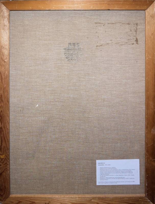 Ursula Ertz, 1941 - 2020, Studium an der Glasfachschule in Hadamar sowie Zeichnen an der Fachhochschule für Kunst und Design in Köln. Hier: "Jungfer in grün", von 1970, Acryl/Lw., 50,5 x 32 cm, re. u. sign. sowie Abstrakte Komposition in Orange und Gelb, Acryl/Lw., 89 x 69,5 cm, sign., dat. 1970; dazu 3 Monotypien, Figürliche Darstellungen, betit. "Tänzchen", "Rassehündchen", & "gehen, stehen", 14,5 x 10,5 cm bis 29,5 x 21 cm, sign., dat, 78/82, betit.; Tuschezeichnung "glatt und gelb, runzlig und grün", Tusche/Buntstift/Papier, 29,5 x 20,5 cm, sign., betit., dat. 1990; dazu Dokumente-Nachlass u.a. mit Fotographien von Bildern, Ausstellungsplakate u. Broschüren, o. Rahmen