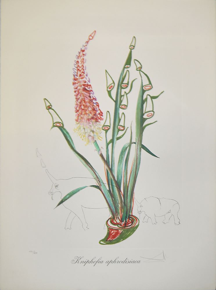Salvador Dali, 1904 - Figueras - 1989, als einer der Hauptvertreter des Surrealismus zählt er zu den bekanntesten Malern des 20. Jahrhunderts., hier: "Kniphofia aphrodisiaca", eine von Dalì erfundene, aphrodisierende Pflanze mit Nashorn-Hörnern (Potenzmittel in China), aus "Surrealistic flowers", Kaltnadelradierung auf Heliogravure mit Reliefdruck und Plattenrand, 56 x 38 cm (Darstellung), 75 x 55 cm (Blatt), num. 201/350, signiert, WVZ: Michler-Löpsinger: Nr. 537, in tadelloser, farbfrischer Erhaltung