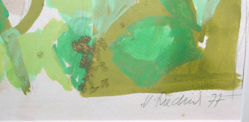 Heinz Friedrich, 1924 - Schwetzingen - 2018, "Die schöne Palatina", weiblicher Akt mit Weinlaub und Trauben umkleidet als Allegorie der Pfalz, Acryl mit Goldhöhung, ca. 37 x 28 cm, sign., dat. (19)77, betit., unter P.p. u. Glas gerahmt, dazu Blumenstillleben in Rot, Farbholzschnitt, 19 x 13,5 cm, sign., dat. (19)89, num. 1/80, unter Glas gerahmt