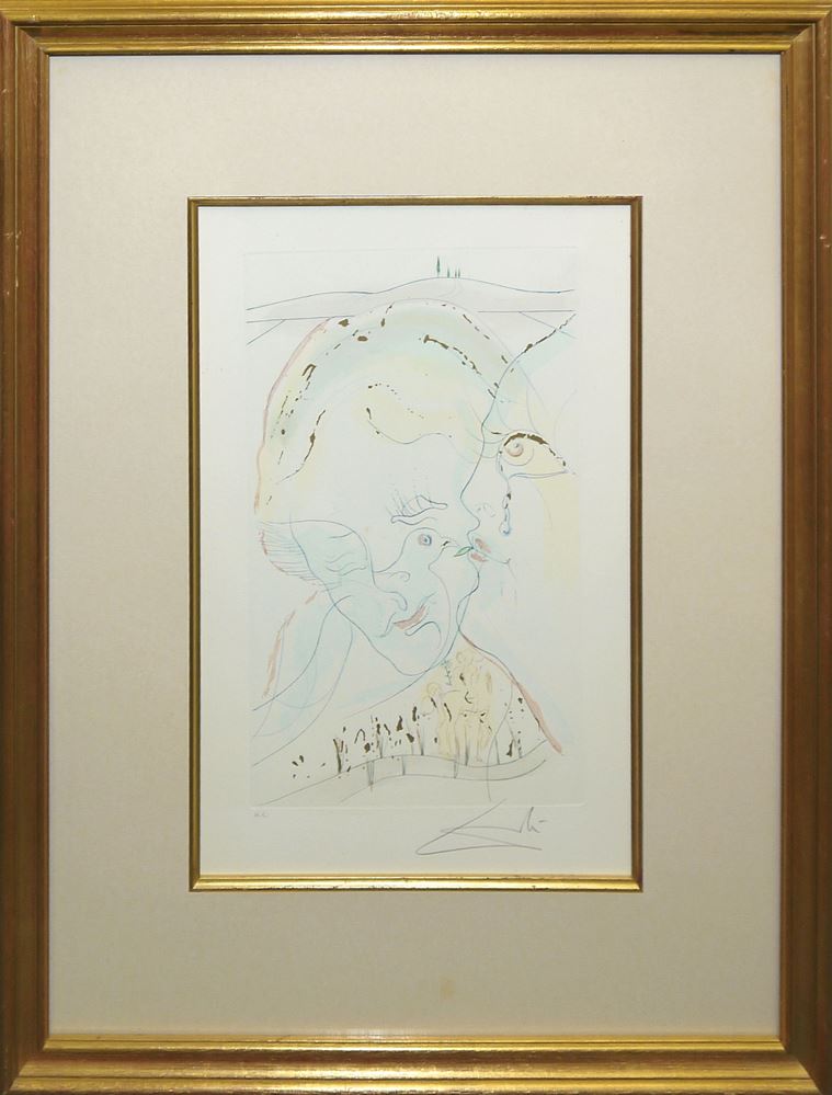Salvador Dalì, "Die Taubenaugen der Braut", sign. Radierung mit Pochoir und Goldauflage von 1971, gerahmt