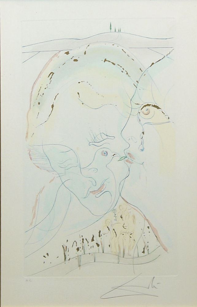 Salvador Dali, 1904 - Figueras - 1989, hier: "Die Taubenaugen der Braut", 5. Blatt aus "Das hohe Lied des Salomon", Radierung mit Pochoir und Goldauflage, 40 x 25 cm (Darstellung), a.) I-VI auf Pergament, b.) VII - L auf Japan, c.) 1-250 auf Arches, d.) 20 H.C. Exemplare, hier eines davon, r. u. sign., WVZ: Michel-Löpsinger Nr. 472, gerahmt