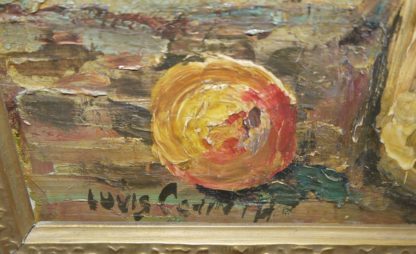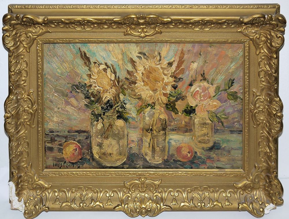 Lovis Corinth, 1858 Tapiau, Ostpreußen - 1925 Zandvoort, das Blumenstillleben mit Sonnenblumen und Äpfeln, zeigt drei Blumenvasen mit mit Sonnenblumen und einer Rose, sowie zwei Äpfeln. Die Farbe ist pastos aufgetragen und der abstrahierende Hintergrund erinnert an die aufgehende Sonne, der stilistische Vergleich mit anderen Werken Corinths (z.B. Rosen und Kalla) lässt auf eine Entstehung um 1915 schließen, im originalen Goldstuckrahmen der Firma H. Gonkel Jr. & Zoon. Zur Provenienz: Im Dezember 1918 - laut erhaltenem Ausstellungsetikett - Teil der Eröffnungsausstellung der Gemälde-Galerie Carl Nicolai in Berlin, danach in Privatbesitz, Öl/Lw., 36 x 54 cm, u. li. sign., verso Ausstellungsetikett der Galerie Carl Nicolai Berlin u. Etikett der Firma H. Gonkel Jr. & Zoon, craqueliert und mit kleinen Farbabplatzungen, Goldstuckrahmen beschädigt. Nicht bei Berend-Corinth.