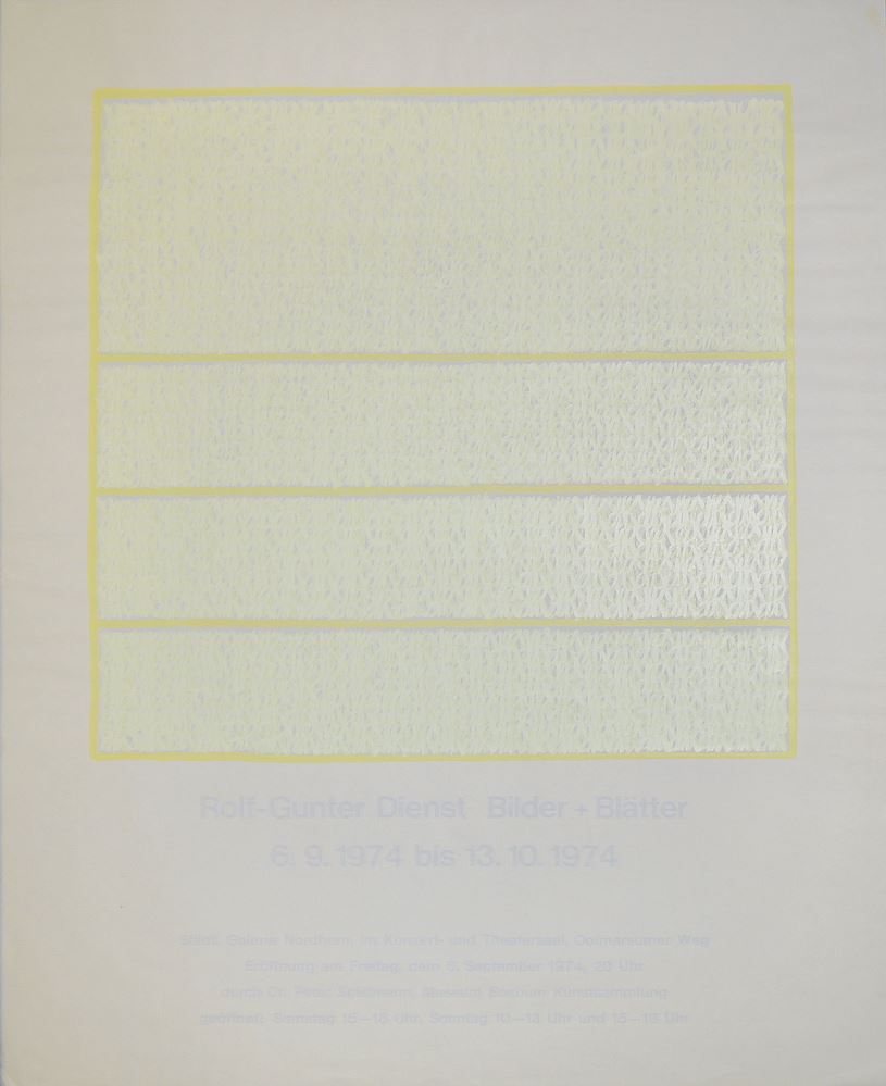 Rolf-Gunter Dienst, 1942 Kiel - 2016 Baden-Baden, "MT.23.7.70", Farbserigraphie/Karton, 57 x 41,5 cm, signiert, datiert (19)70, betitelt, nummeriert XXII/XXX, Blatt etwas berieben; "Bochumer Blatt", Farbserigraphie/Karton, 50 x 50 cm, signiert, datiert 1974, betitelt und bezeichnet Probe; Abstrakte Komposition, Farbserigraphie/Karton, 49,5 x 54,5 cm, signiert, datiert 1977, unleserlich betitelt, bezeichnet Probe; Ausstellungsplakat Galerie Nordhorn, Bochum 1974, Farbserigraphie, ca. 51 x 51 cm (Größe gesamt: 82 x 64 cm), leicht wellig, sonst alle in gutem Zustand