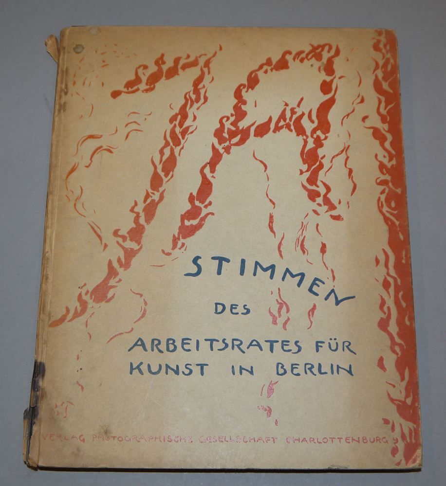Antiquarisches: JA! Stimmen des Arbeitsrates für Kunst in Berlin, verlegt bei der photographischen Gesellschaft in Charlottenburg 9, 1919, darin ein originaler Holzschnitt "Rathaus" von Lyonel Feininger (1871 - New York City - 1956) als Titelblatt, eins von 55 Exemplaren, 115 S., mit 41 Bildtafeln im Druck betit. u. sign., wichtiges Dokument zur Vorgeschichte des Bauhauses. Mit Beiträgen u.a. von Adolf Behne, Walter Gropius, Max und Bruno Taut, Einband mit Altersspuren