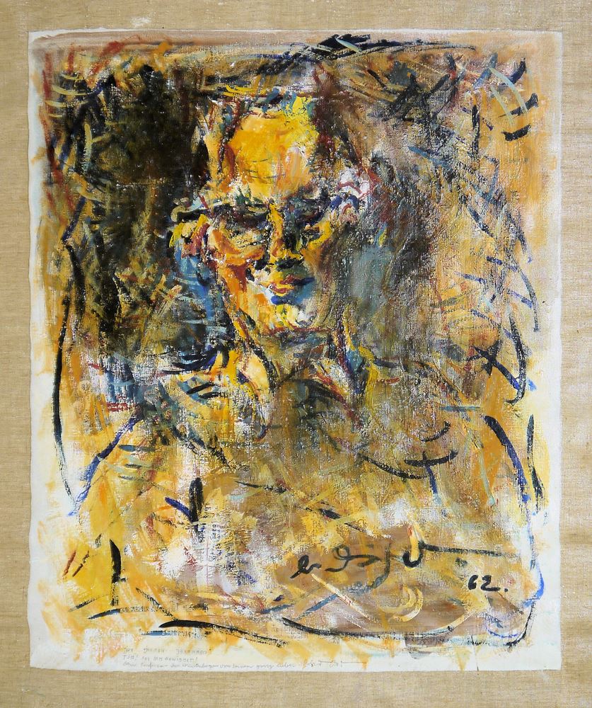 Eberhard Doser, 1926 Gerstruben - 2018 Castres, "Hörsames Bild für Piano u. zwei Saxophon's in sieben Farben-Tönen 1963", Buntstift/Papier, 53 x 61 cm, signiert, datiert 1969, mit Widmung und Bezeichnung, unter Glas gerahmt; "Gravure Acoustique pou la musique eletronique", Buntstift/Papier, 31 x 43 cm, signiert, datiert Paris 1966, betitelt, unter Glas gerahmt; "Dha ... Dhaaaa....Dhaaaaaa", Porträt Prof. Würtenberger, Öl/Lw., 67 x 55 cm, signiert, mit Widmung, betitelt, o. Rahmen