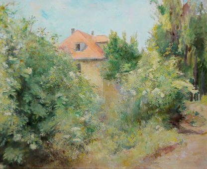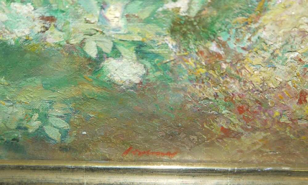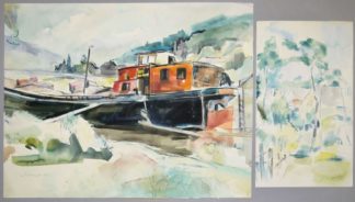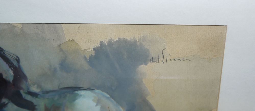Walter Eimer, 1899 Ladenburg/Neckar - 1983 Heidelberg, hier: Dreiviertelakt einer sitzenden Frau, dem Kopf nach unten geneigt, Aquarell & Deckfarben, ca. 50 x 35 cm, r. o. sign., unter P.partout gerahmt // Karl Stohner, Karl Stohner, 1894 Mannheim - 1957 Paris, hier: Blick durch Büsche und Bäume auf das das rote Dach und die Wand eines Hauses, Öl/ Lw., 45 x 60 cm, l. u. sign., verso Nachlass- Stempel, gerahmt