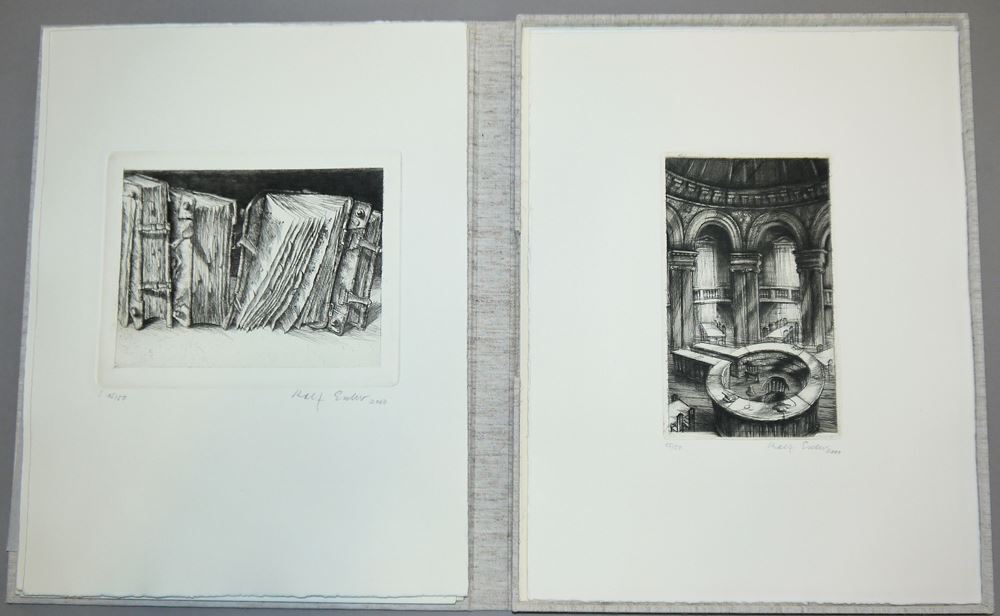 Rolf Escher, *1936 Hagen, "Bücherzeiten", Mappe in kleiner Auflage mit 8 Radierungen, welche in den Jahren 1994 bis 2000 entstanden sind, Blattgröße je 39,5 x 30 cm, je signiert, datiert und nummeriert 15/50, in Original-Leinenmappe, sehr guter Zustand