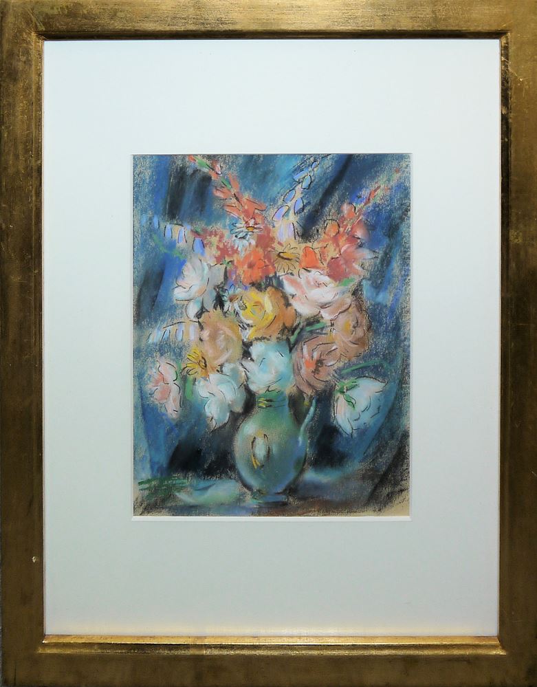 Pierre Le Faguays, 1892 Nantes - 1962 Paris, französischer Bildhauer des Art déco und Maler, hier: Farbiges Stillleben in Vase, Pastell, 30 x 24 cm, verso Galerie-Etiketten, unter Glas und P.p. im Goldrahmen
