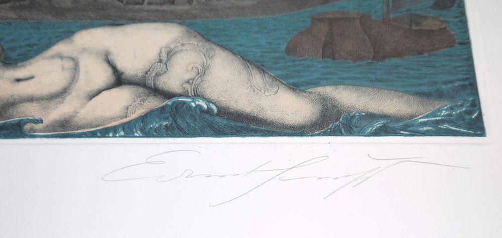 Ernst Fuchs, Das Gefängnis des Ikarus, signierte Farbaquatinta-Radierung von 1975 Ernst Fuchs, 1930 Wien - 2015 Wien, Das Gefängnis des Ikarus, Farbaquatinta-Radierung, 49,5 x 34 cm, signiert, nummeriert 162/200, horizontale Falte im unteren Randbereich, sonst sehr guter Zustand, o. Rahmen Zum Künstler: Maler, Grafiker, Illustrator, Verfasser von Kinderbüchern. Zunächst begann er eine Goldschmiedelehre und besuchte daraufhin die Kunstgewerbeschule Stuttgart; 1945 Beginn der Arbeit in Stuttgart; 1946-47 Studium an der Kunstakademie Stuttgart bei Willi Baumeister zu dessen Freund und Meisterschüler er wurde; 1947 erste Ausstellung in der Galerie Herbert Hermann (Stuttgart); 1949-58 Lehrauftrag für Textilentwurf an der Kunstakademie Stuttgart; ab den 50er Jahren folgen zahlreiche Ausstellungen im In- und Ausland.