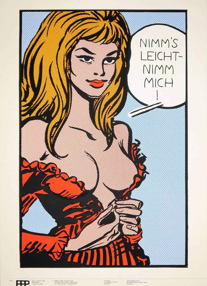 Jean-Claude Forest, 1930 Le-Perreux-sur-Marne - 1998, französischer Comiczeichner, hier: "Lies mich, Baby", aus: Barbarella, Farbserigraphie, Blattgröße 86,5 x 59,5 cm, am unteren Rand typographisch bezeichnet, Handpressendruck Serigraphisches Atelier Laube, München, o. Rahmen