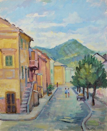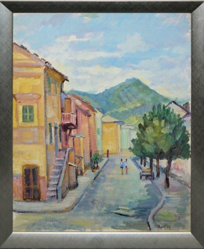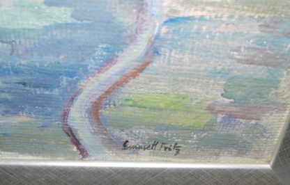 Emmett Fritz, Straßenszene St. Augustine, Florida, Ölgemälde, gerahmt Emmett Fritz, 1917-1995, amerikanischer Künstler aus Florida, hier: Straßenszene mit farbigen Häusern in St. Augustine, Florida, Öl/festem Papier, 60 x 50 cm, signiert, im Silberrahmen Zum Künstler: Emmet Fritz war ein Künstler, der sein ganzes Leben lang in Florida lebte und arbeitete und für seine Stillleben, Landschaften, Meeresbilder, Karikaturen in Acryl und Öl bekannt war. Er wurde zu einem der beliebtesten Künstler von St. Augustine, wurde 1951 als neues Mitglied des St. Augustine Arts Club und der Florida Art Association aufgenommen und war einst Schüler von Norman Rockwell. Er gehörte zu St. Augustines „Lost Colony” (Verlorene Kolonie) von Künstlern, die in Robert Turchias „The Artists of St. Augustine” (Die Künstler von St. Augustine) 1930-1950 vorgestellt wurden.