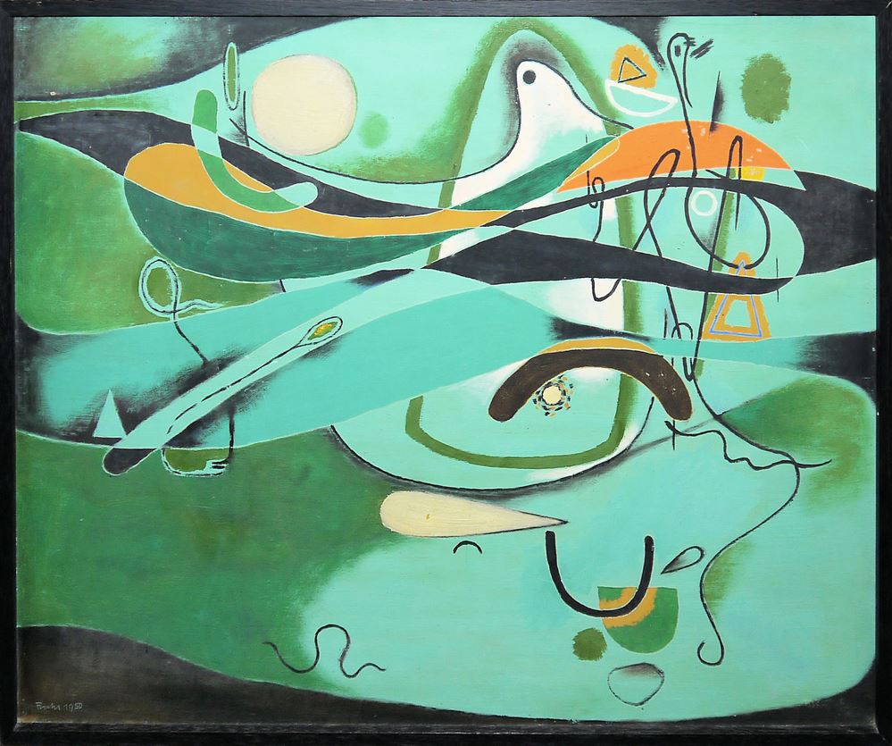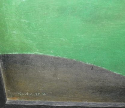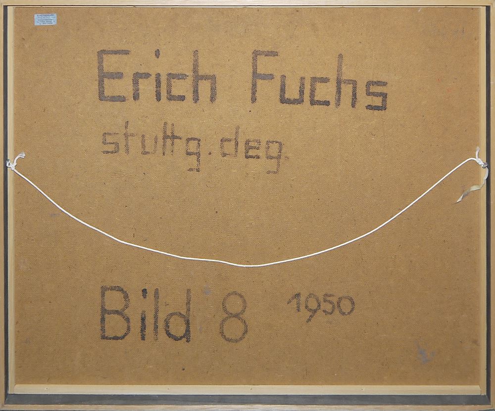 Erich Fuchs, Abstrakte Kompositionen, 2 Ölgemälde von 1950, in Leiste gerahmt Erich Fuchs, 1916 - Stuttgart - 1990, "Grünes Dreieck" und "Bild 8", je Öl/Platte, ca. 59 x 74,5 cm, je signiert, datiert 1950, in Leiste gerahmt Zum Künstler: Maler, Grafiker, Illustrator, Verfasser von Kinderbüchern. Zunächst begann er eine Goldschmiedelehre und besuchte daraufhin die Kunstgewerbeschule Stuttgart; 1945 Beginn der Arbeit in Stuttgart; 1946-47 Studium an der Kunstakademie Stuttgart bei Willi Baumeister zu dessen Freund und Meisterschüler er wurde; 1947 erste Ausstellung in der Galerie Herbert Hermann (Stuttgart); 1949-58 Lehrauftrag für Textilentwurf an der Kunstakademie Stuttgart; ab den 50er Jahren folgen zahlreiche Ausstellungen im In- und Ausland.
